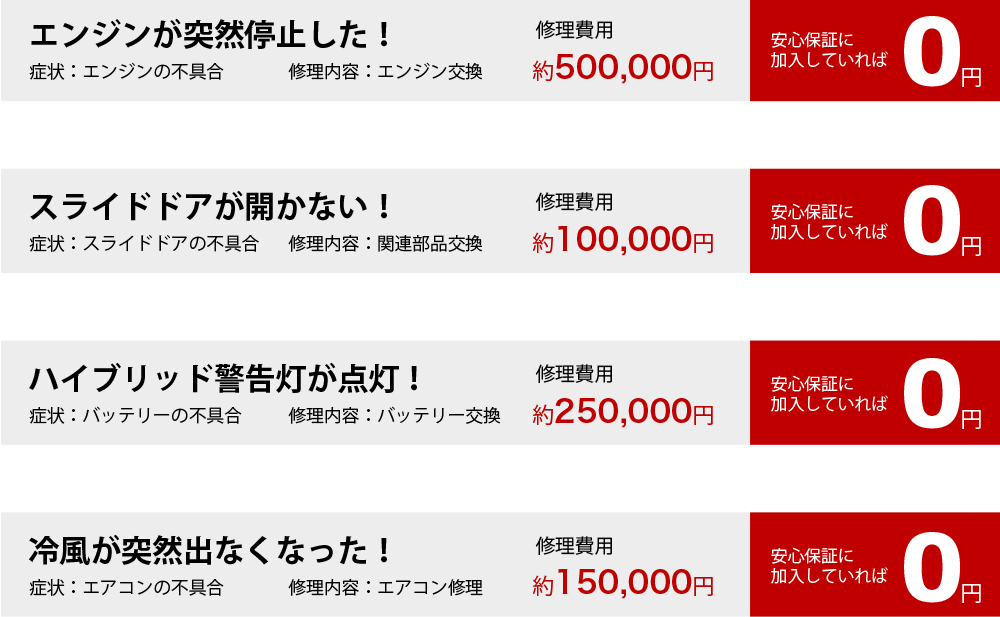 「保証対象項目表」に掲載されている部品が主原因の場合、修理代が無料となります。小さな掛け金で大きなサポートを継続して受けられるのが、中古車専用保証ならではのメリットです。
